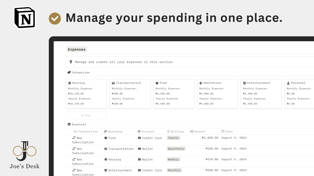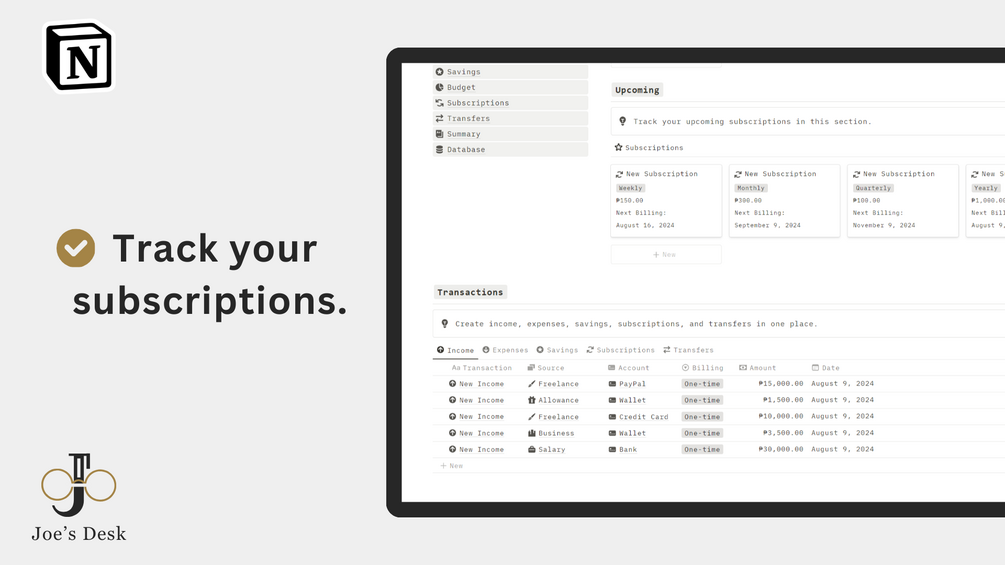 Inclusions: Accounts, Income Tracker, Expense Tracker, Cash Transfers, Subscription Tracker, Budget Planner, Savings Tracker, and Transaction History