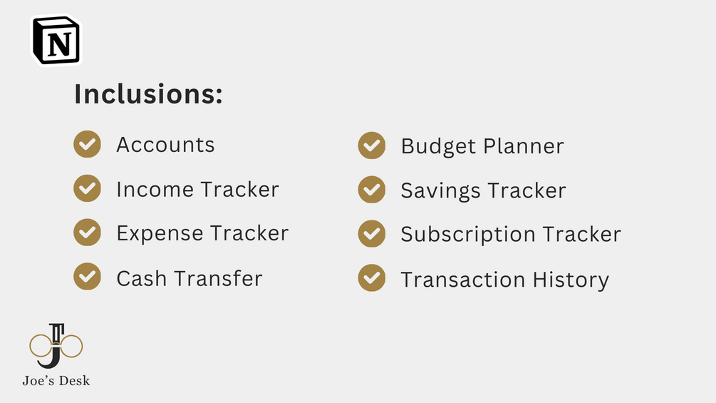 Inclusions: Accounts, Income Tracker, Expense Tracker, Cash Transfers, Subscription Tracker, Budget Planner, Savings Tracker, and Transaction History