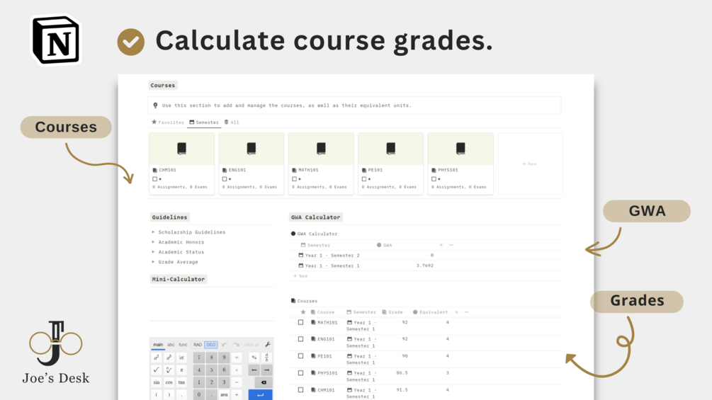 Inclusions: Semester Organizer, Course Organizer, GWA Calculator, Assessments Tracker, To-do List, Pomodoro Timer