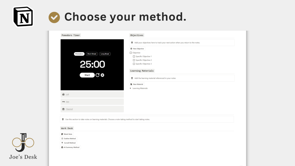 Inclusions: Notebook Manager, Notes Manager, Note-taking Method Templates (Outline Method, Cornell Method, AI Summary), Pomodoro Timer